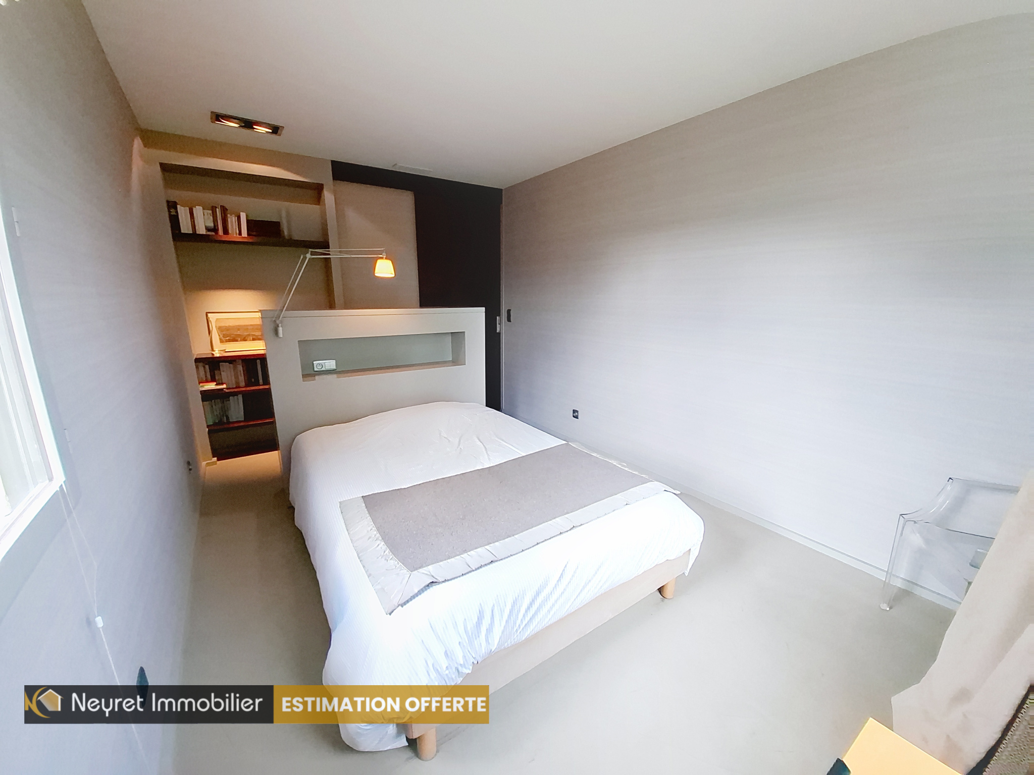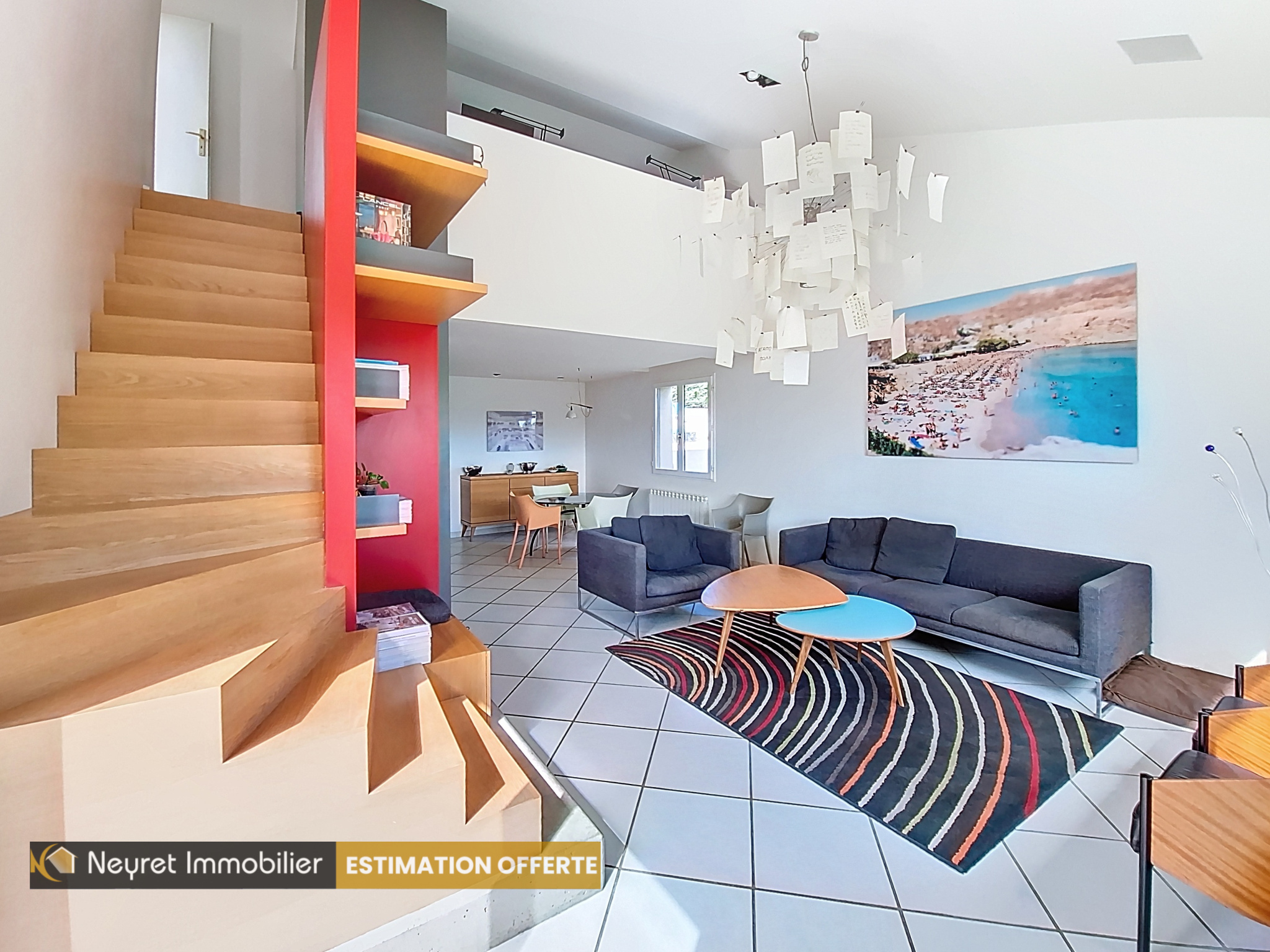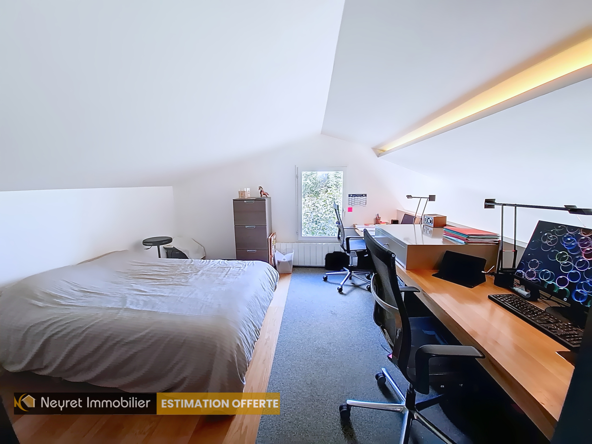 A l'étage, vous découvrirez en accèdant par un escalier design en chène nature, à une chambre mansardée en mezzanine et à une petite suite.