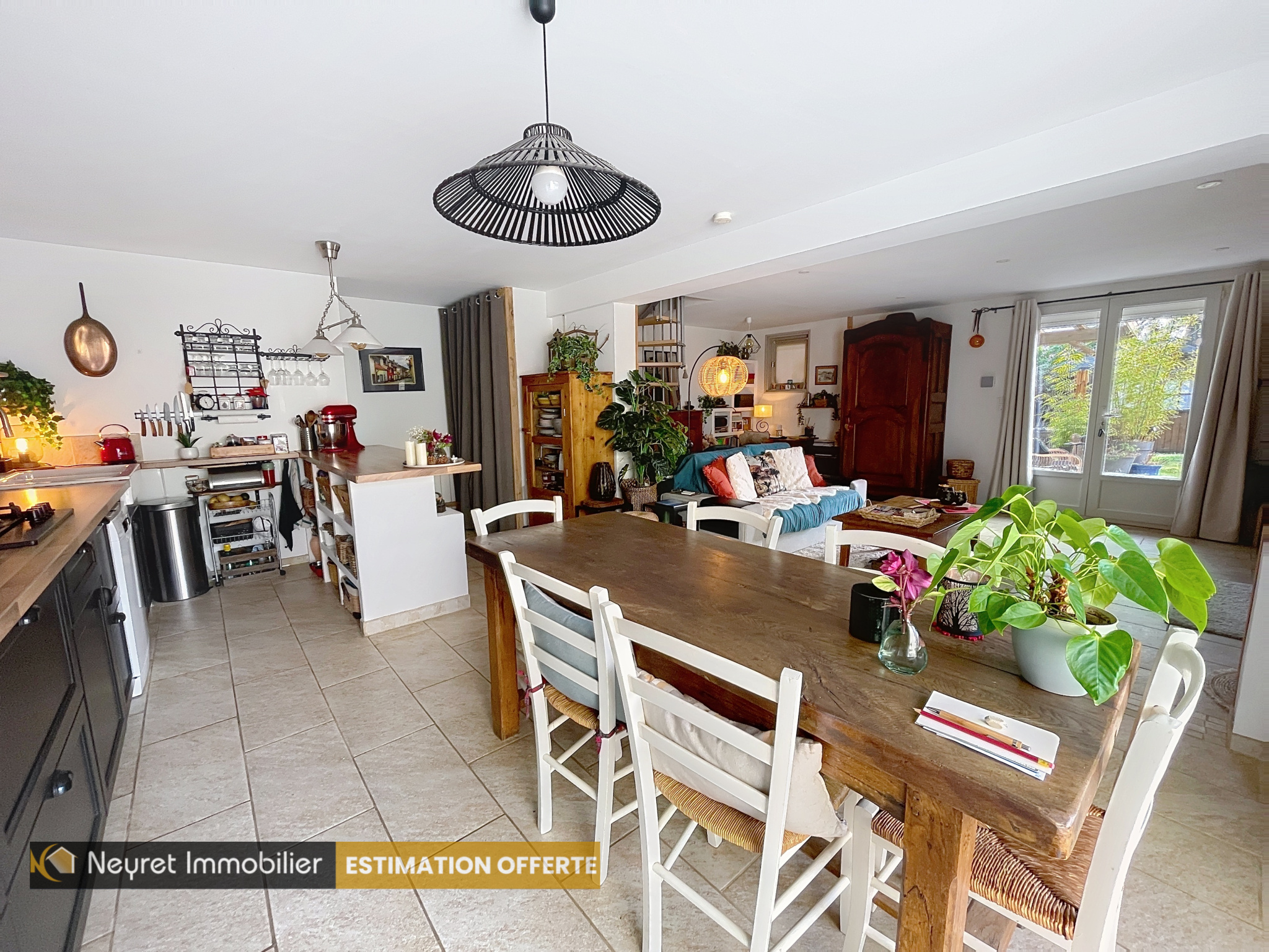 La maison offre une belle pièce de vie de 44 m² avec cuisine ouverte, lumineuse, donnant accès à deux terrasses, idéales pour profiter des extérieurs.