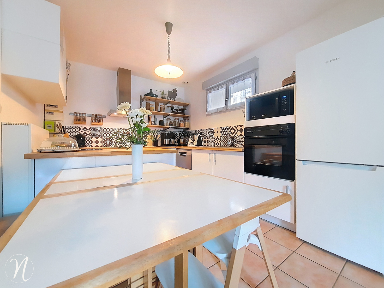 Au rez-de-chaussée : séjour/salon avec cuisine ouverte, donnant accès à une cour intérieure privative, une buanderie et WC indépendant compléte ce niveau