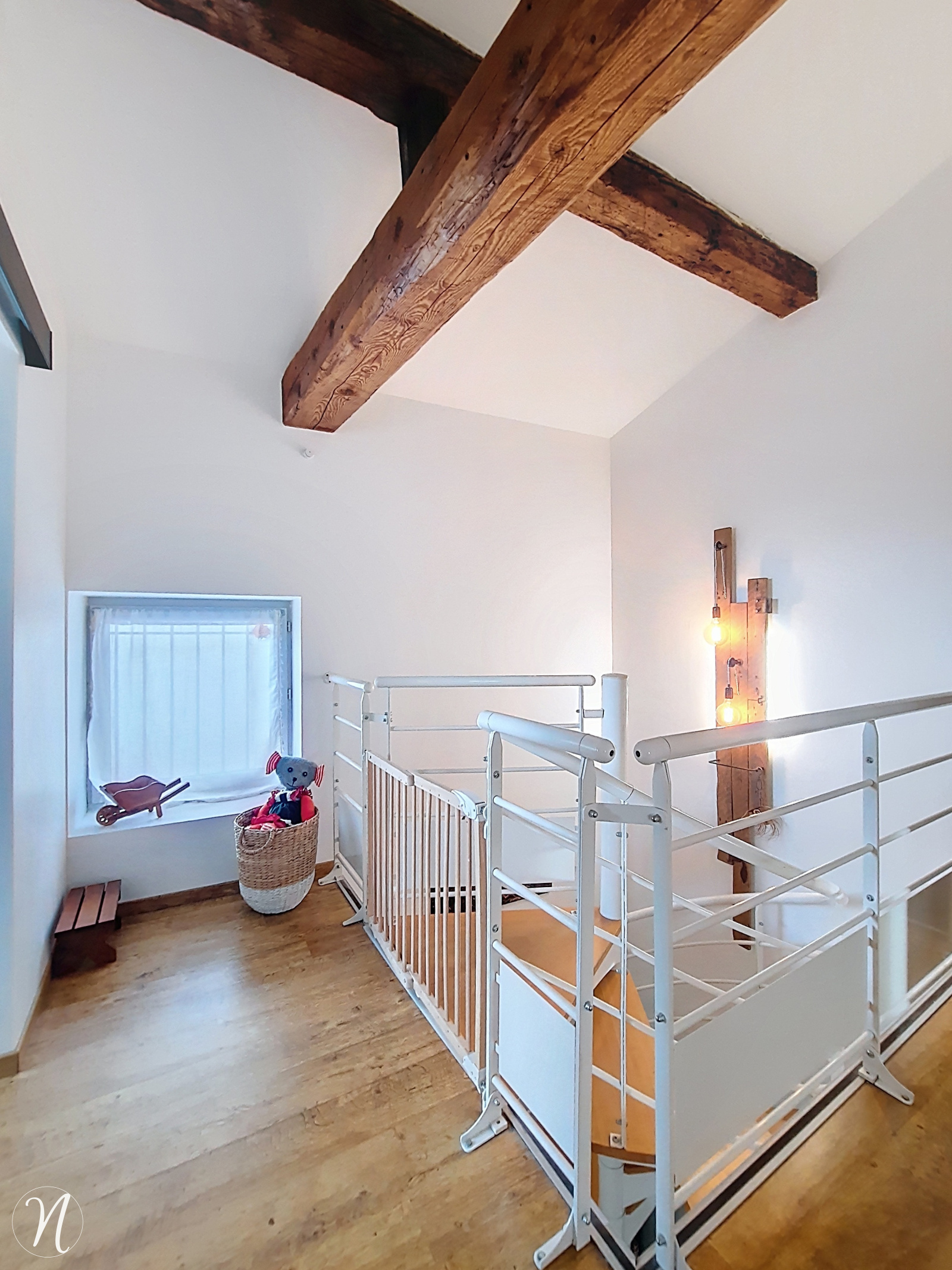 À l’étage : mezzanine lumineuse avec poutres apparentes, 3 chambres avec rangements, salle de bain avec baignoire et WC.